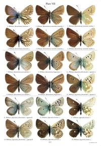 ヒョウモンモドキ(Melitaea)属98種(5新種の記載を含む)の分布図、多くのタイプ標本を含む成虫カラープレート(24図版)、♂交尾器の線画が掲載されている。