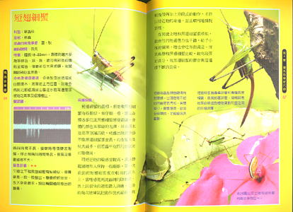 台湾に産する直翅目のうち、コオロギ・クツワムシ・ウマオイなど代表的な鳴く虫31種を紹介。なお学名の表記は一切なく、台湾でも一般人向きの「鳴く虫入門書」と思われる。